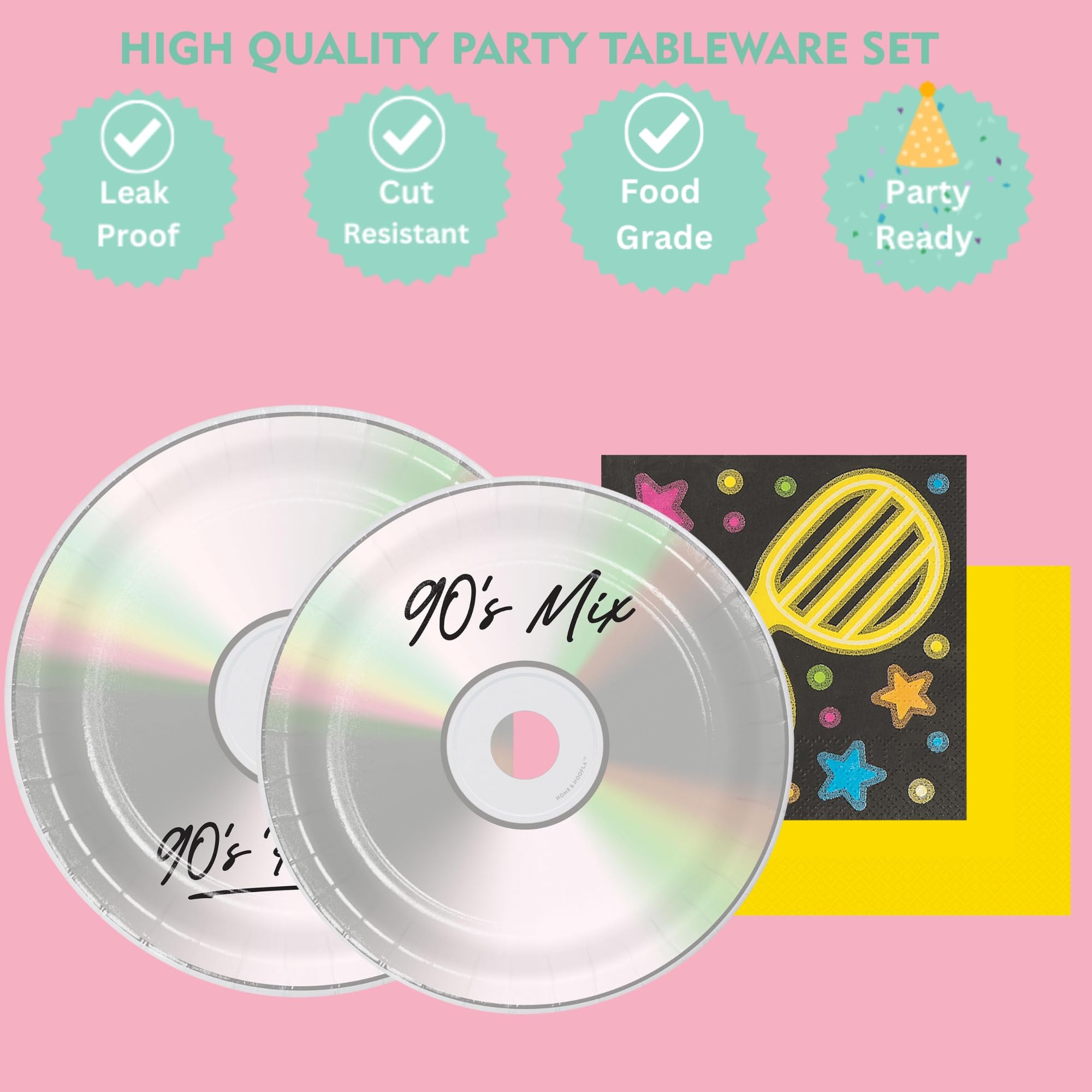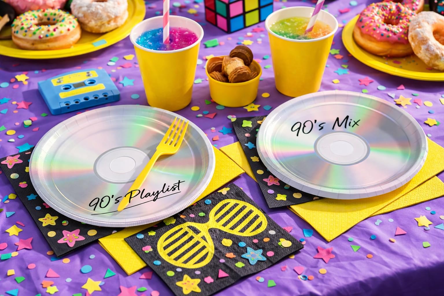 - 💿Featuring fun 90's themed square plates paired with “90’s Mix” CD plates, floppy disk, and cassette tape designed napkins in a classic color scheme.