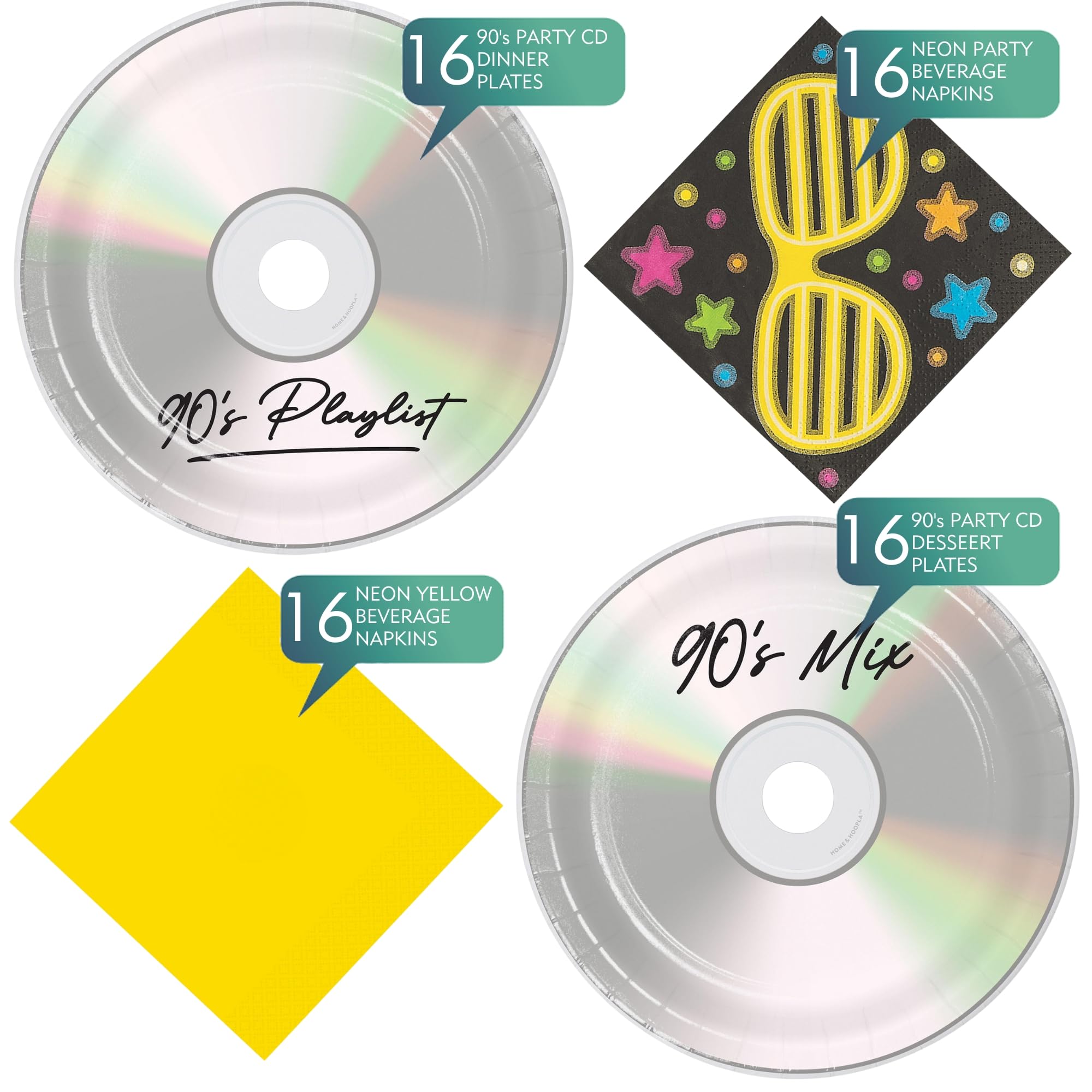 Celebrate the good ol' days with our 90's Party Variety Pack! 90's Party Supplies - 90's CD Mix Round Paper Dinner and Dessert Plates With Assorted Neon Glow Beverage Napkins (32 Plates & Napkins)