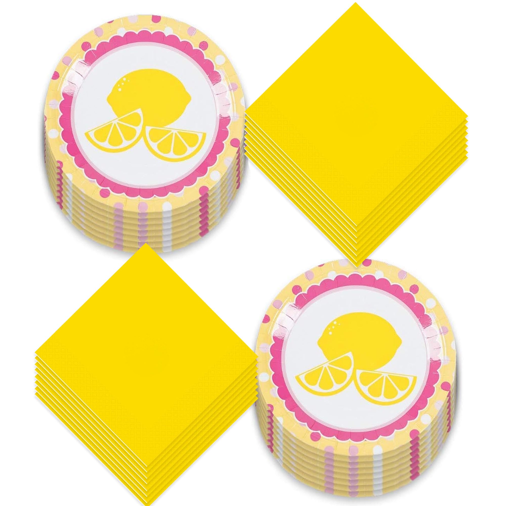 Lemon Party Supplies - Pink Lemonade Lemon Slice Paper Dinner Plates and Luncheon Napkins (Serves 16)