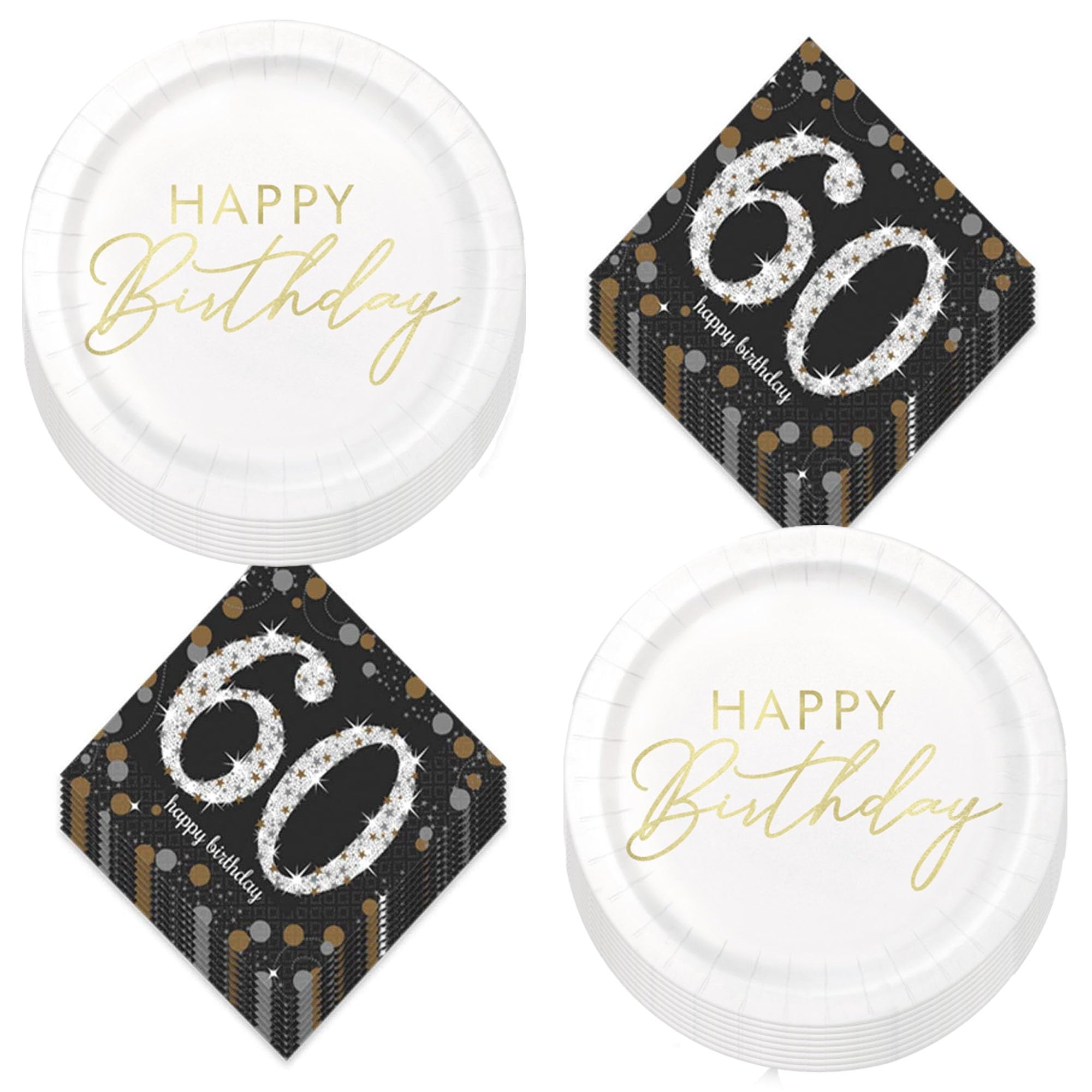 Details: Your 60th birthday party will sparkle with this set of Metallic Dessert Plates and Napkins! Take your party table display up a notch with fancy metallic silver and gold shine. Sturdy dessert size tableware will serve appetizers, finger foods, and treats for up to 16 guests. Plus, paper tableware makes cleanup a breeze!