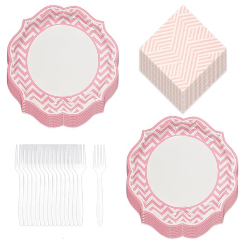 Pretty Pink Chevron Scalloped Paper Dinner Plates, Napkins, and Forks For Baby Showers, Bridal Parties, and Birthdays (Serves 16)