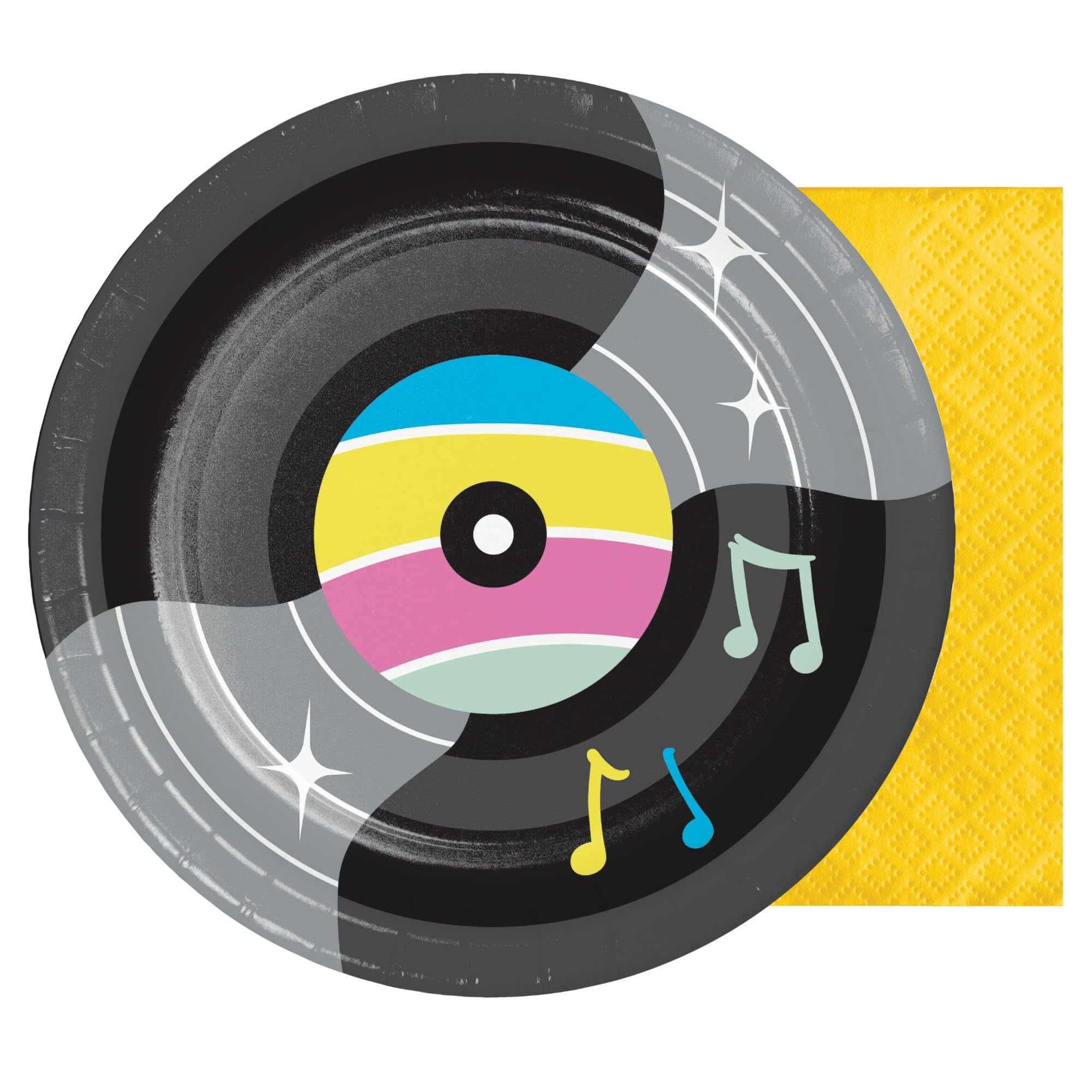 Record Themed Dessert Paper Plates and Solid Yellow Beverage Napkins, 50's Party Decorations (Serves 16)