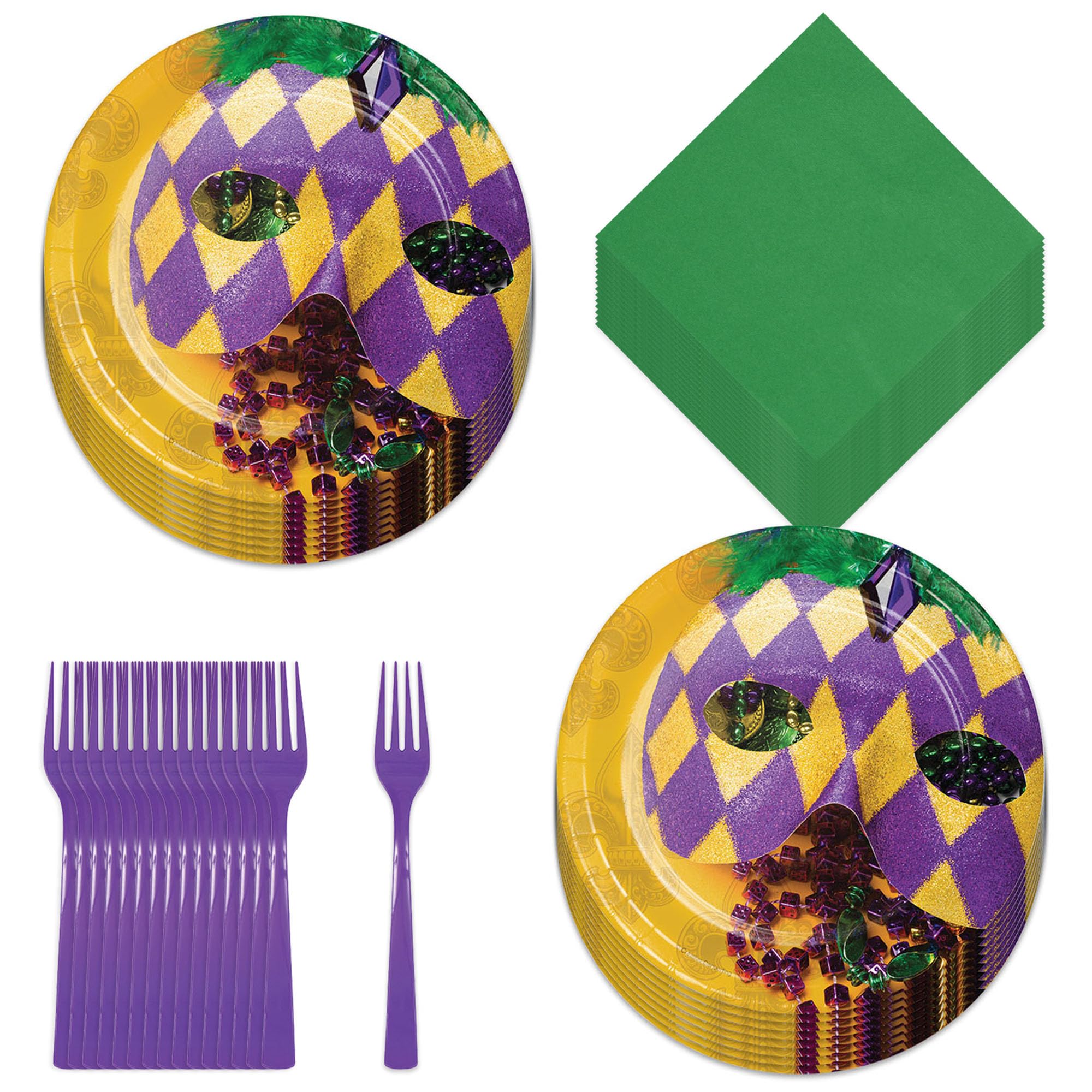 Live It Up! Party Supplies Masks of Mardi Gras Paper Dessert Plates, Napkins, and Forks (Serves 16)