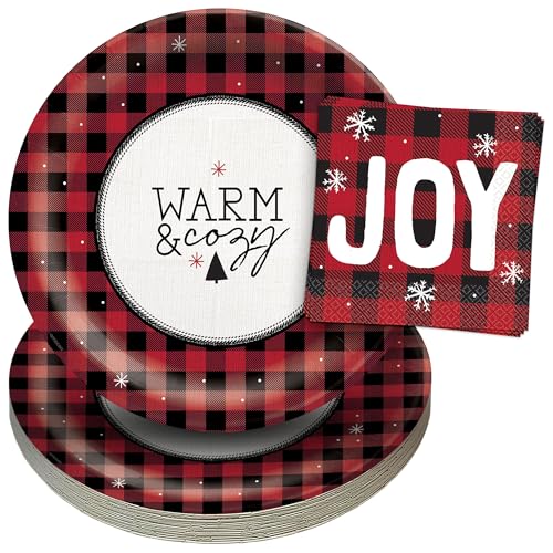Live It Up! Party Supplies Red & Black Buffalo Plaid Warm and Cozy Happy Holidays Paper Dinner Plates With Lunch Napkins (Serves 16) - Christmas and Holiday Paper Tableware