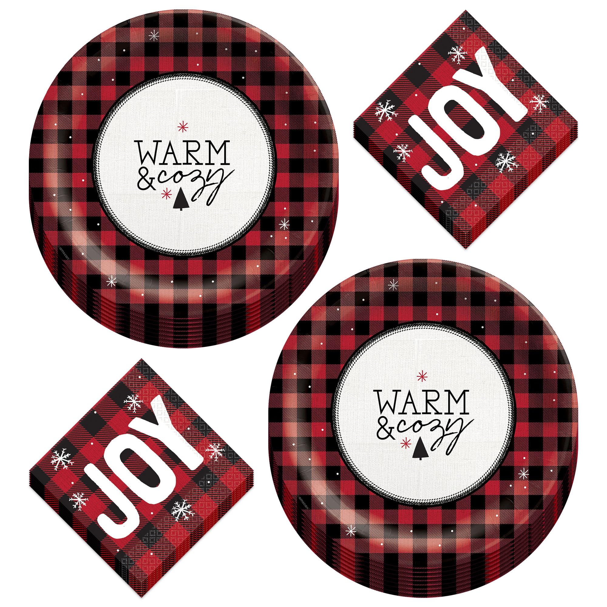 - Create a cozy tablescape with red & black buffalo plaid accents with "Warm & Cozy" plates and "Happy Holidays" napkins.