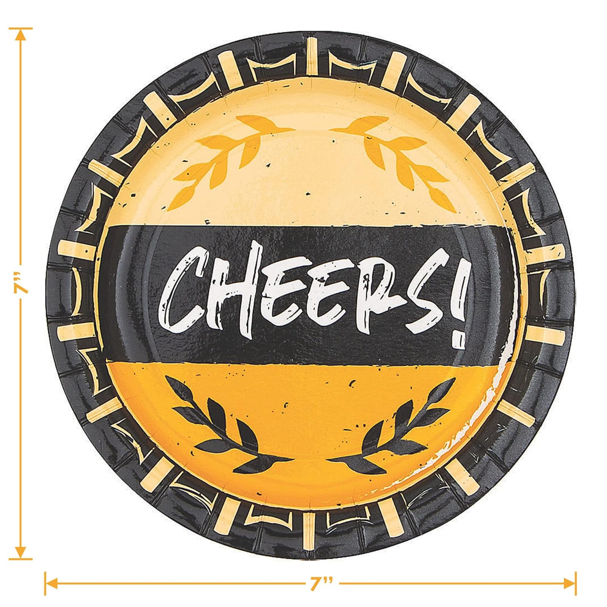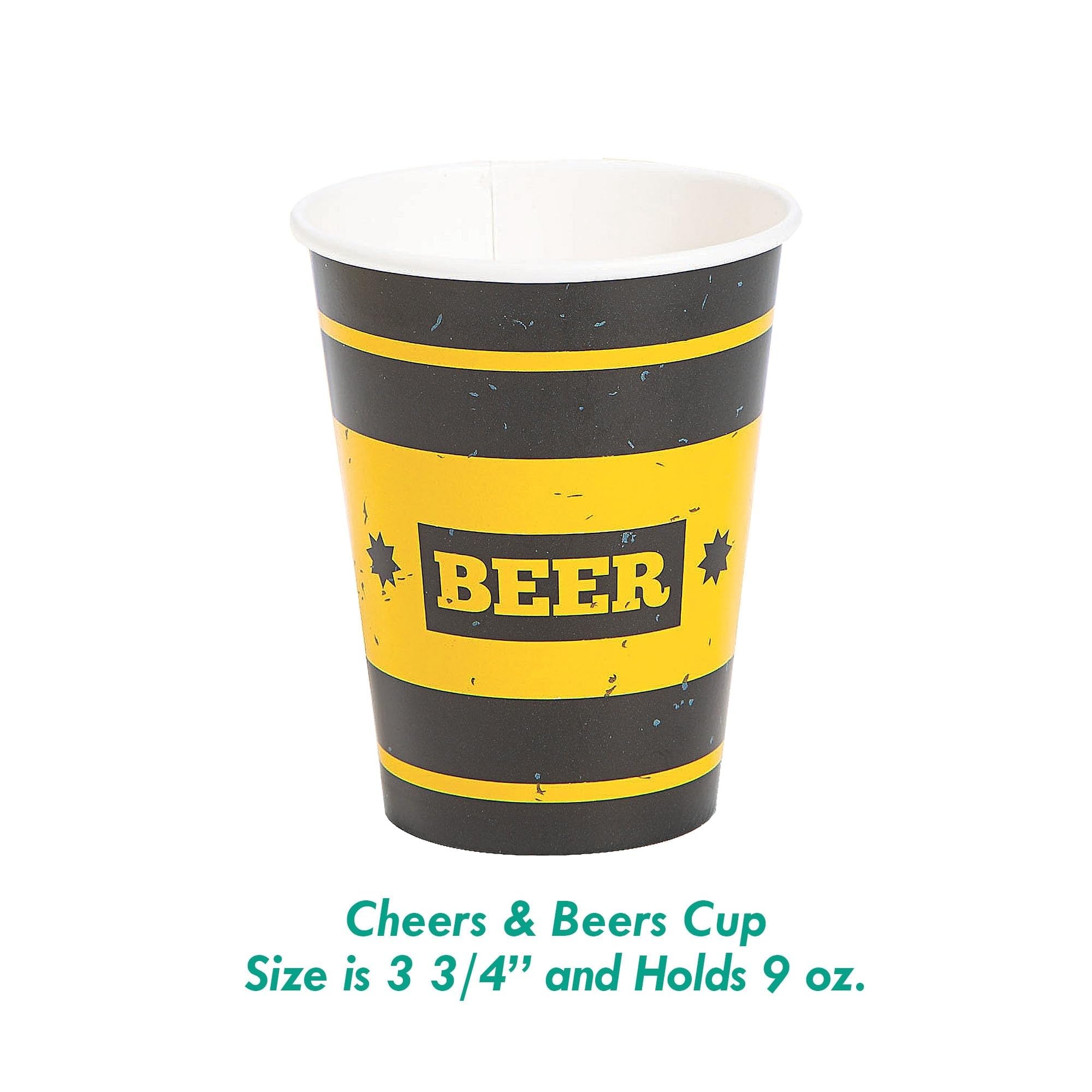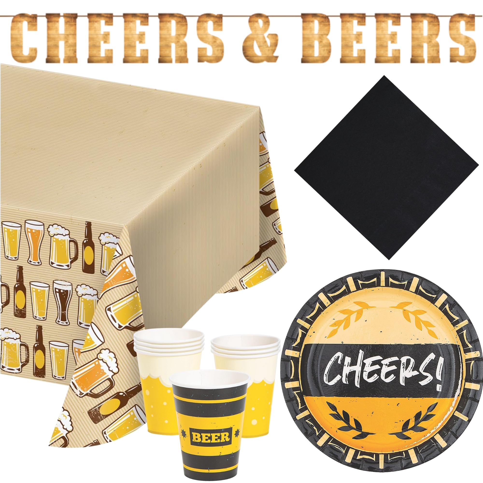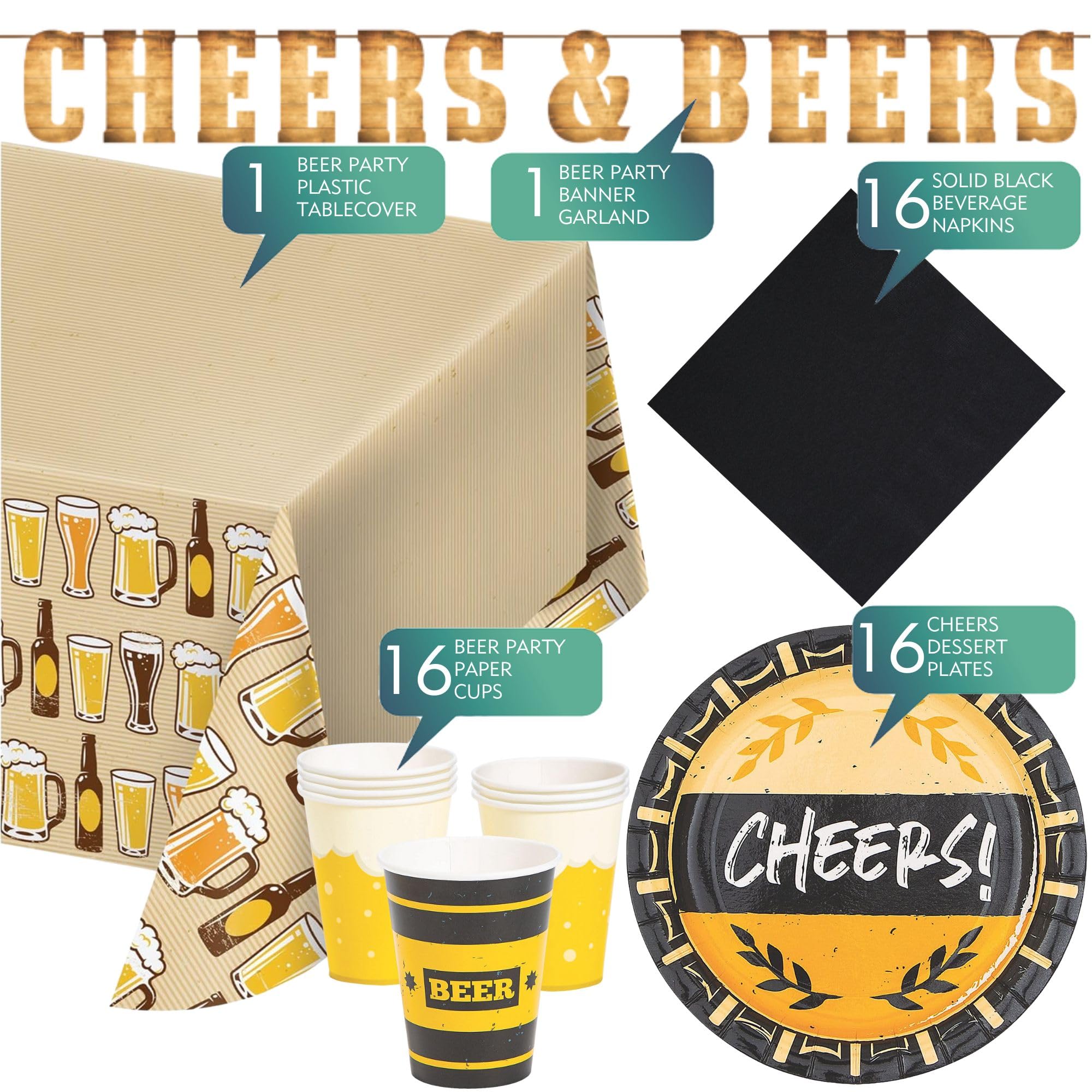 Cheers and Beers Party Pack - Paper Dessert Plates, Beverage Napkins, Cups, Table Cover, and Garland Set (Serves 16)
