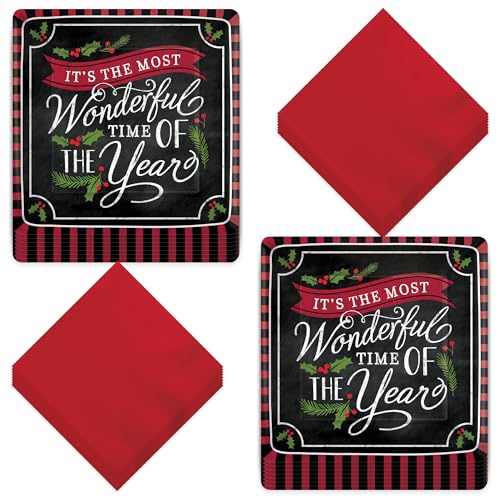 Details: Create an inviting tablescape with this Most Wonderful Time of the Year Dinner Set! Beautiful holiday sentiment tableware with holly designs and red & black buffalo plaid accents will be the perfect addition to holiday tables. Use this cozy set at holiday gatherings or Christmas parties with family and friends! Large square plates serve holiday meals and dessert for up to 16 guests. Plus, paper tableware makes cleanup a breeze! Napkins are a Creative Converting product.