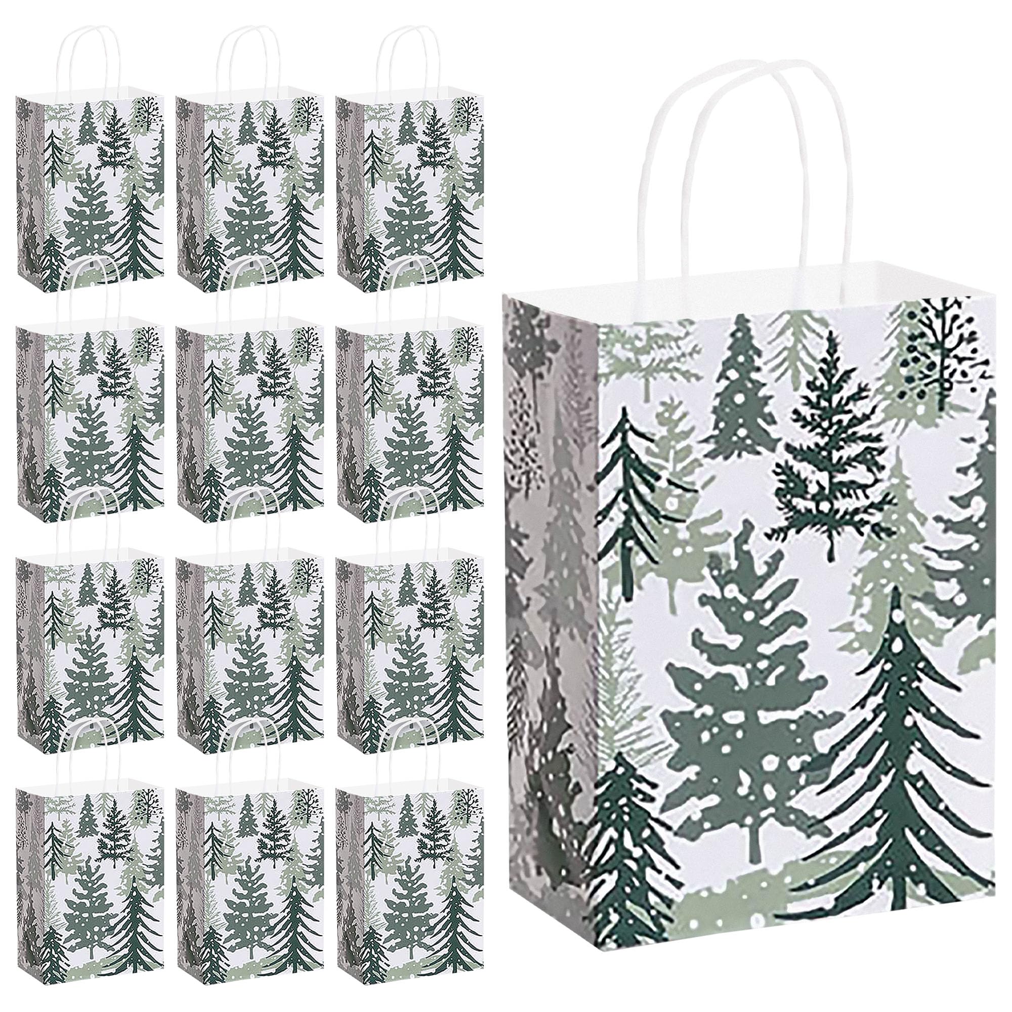 Christmas & Winter Snowy Pine Paper Gift Bags and Party Favor Bags, Small Size - 5.25 Inches x 3.5 Inches x 8.25 Inches (12 Pack)