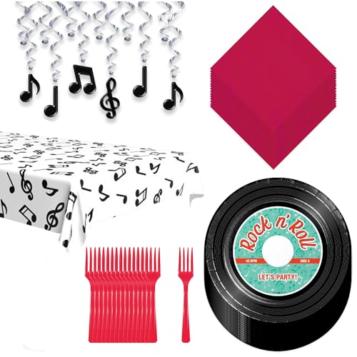 50's Party Decorations - Record Paper Plates, Napkins, Music Note Table Cover, Music Note Hanging Whirls, and Red Plastic Forks (Serves 16)