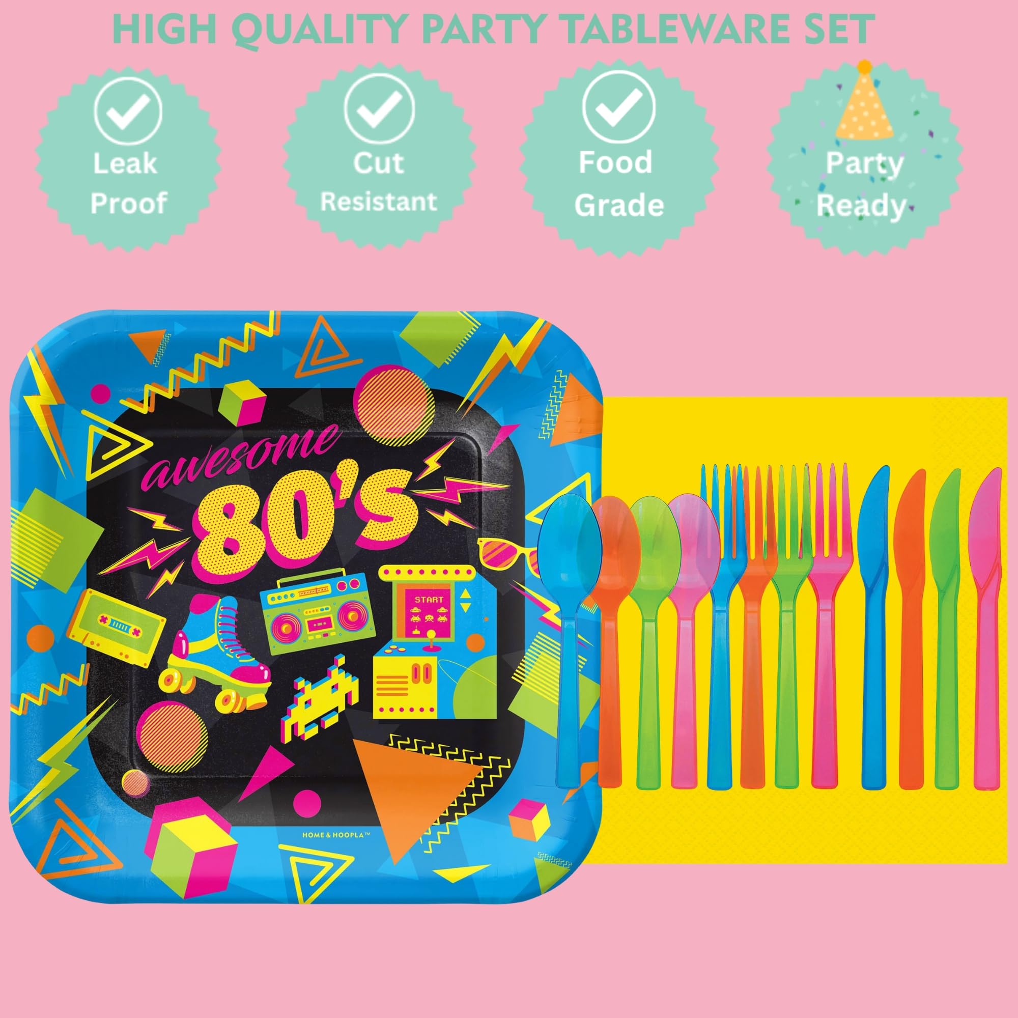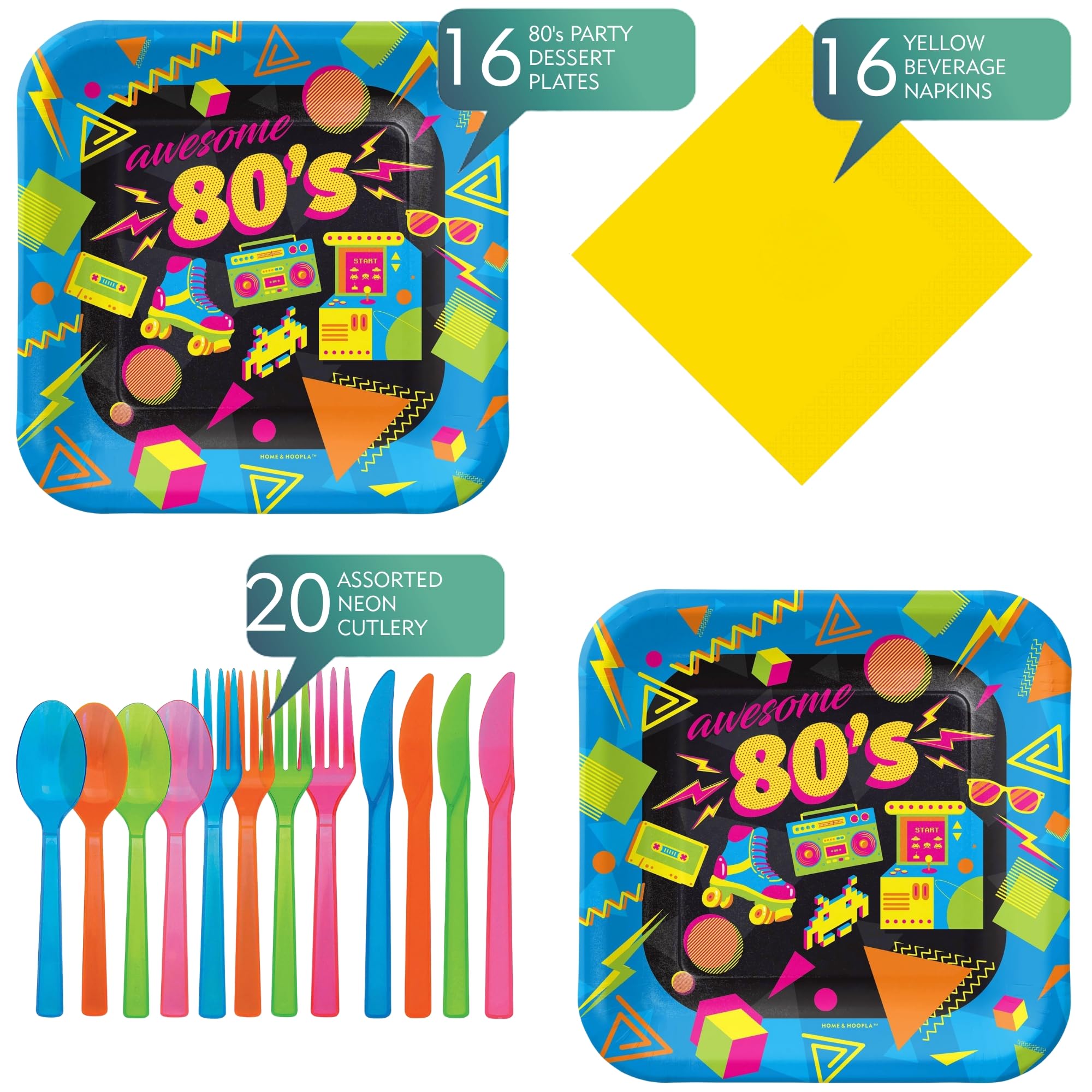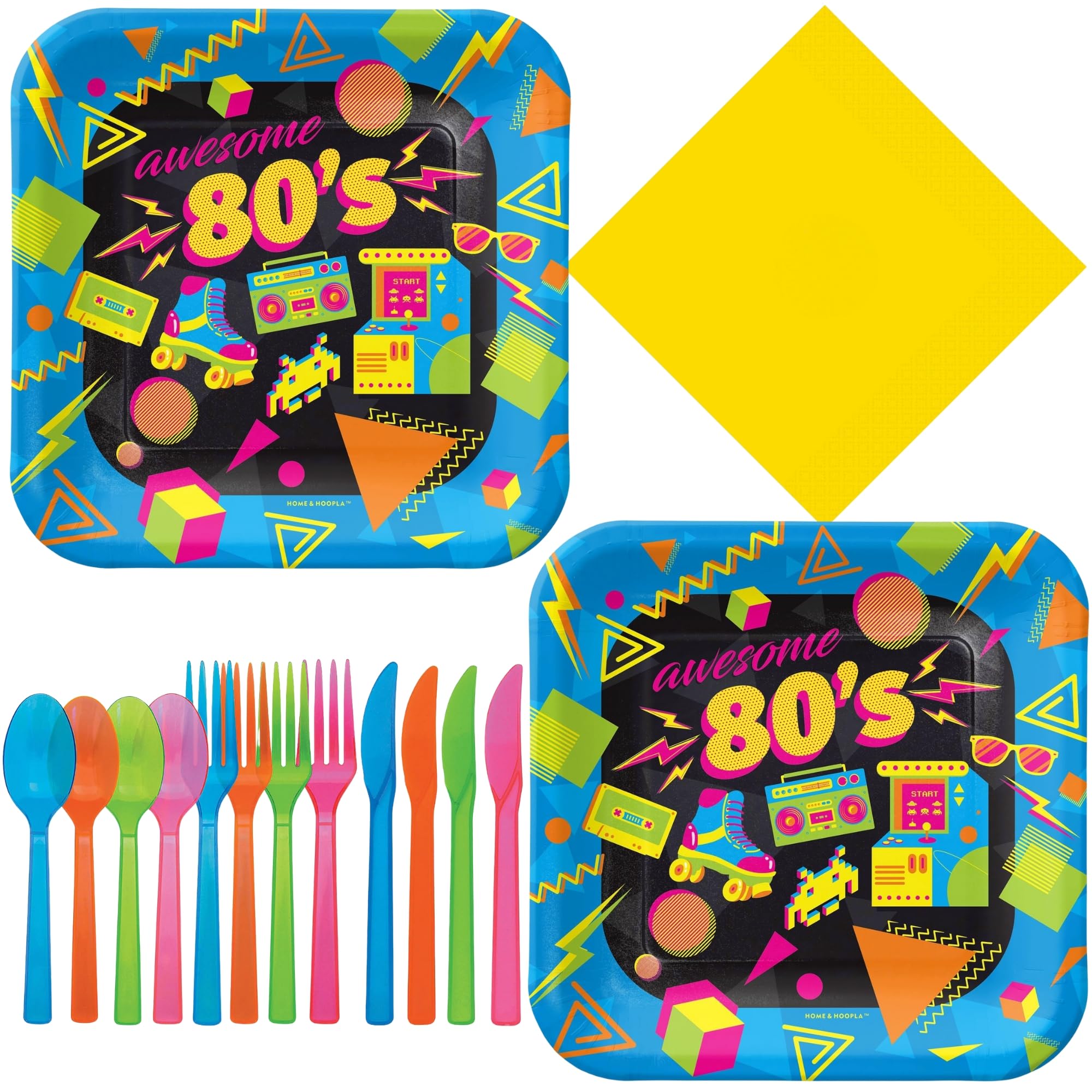 80's Party Supplies - Totally Awesome Throwback Theme Square Paper Dessert Plates, Napkins, and Forks (16 Plates, Napkins, and Forks)
