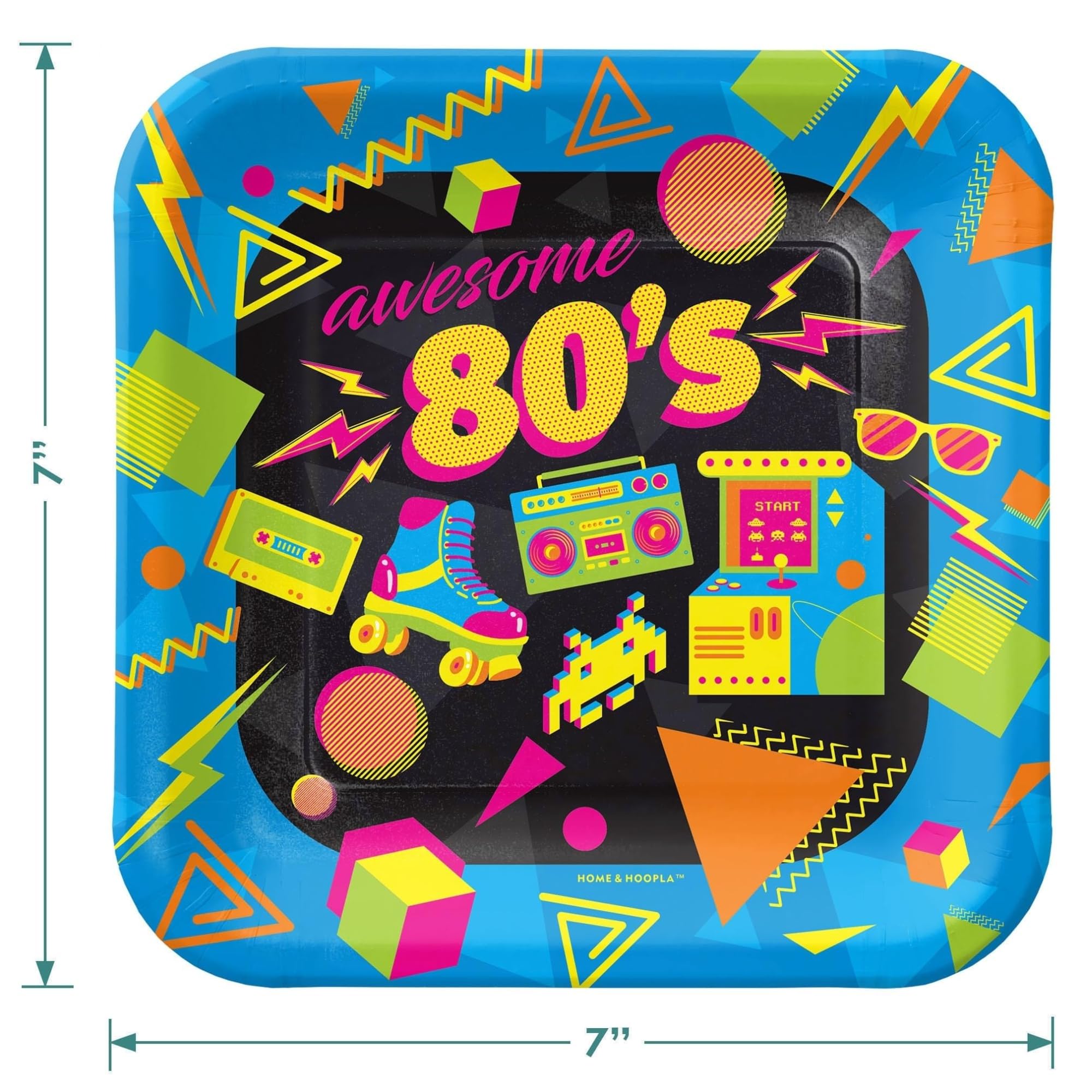 Details: Celebrate the greatest decade with this Totally Awesome 80's Dessert Set! Use these paper party supplies at your next 80's themed event to take a stroll down memory lane. Paper plates and napkins feature classic 80's designs - a true sign of the times! Serve desserts, finger foods, and appetizers for up to 16 guests. Plus, paper tableware makes cleanup a breeze!