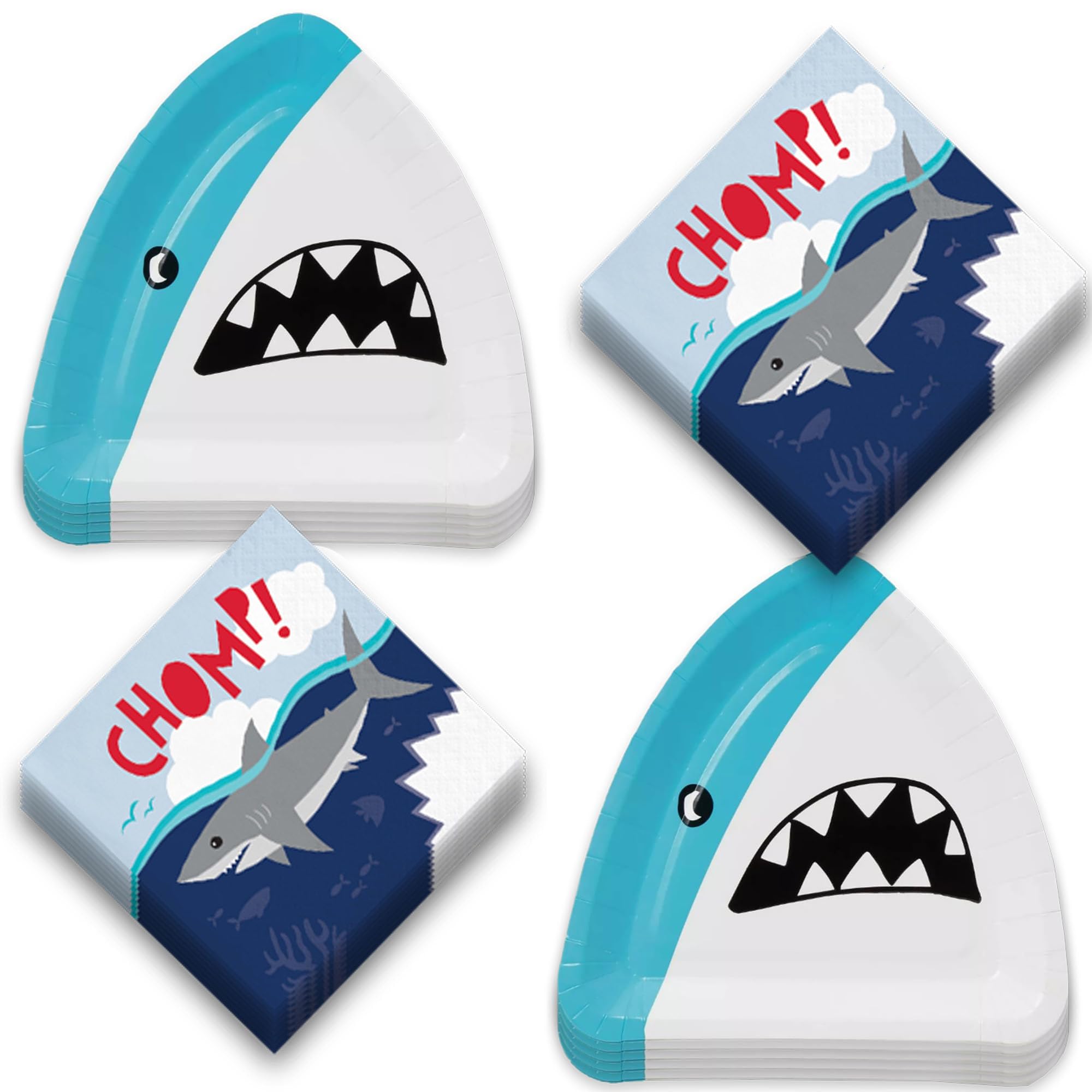 Shark Party Supplies - Shark Bite Shaped Paper Dessert Plates and Chomp Beverage Napkins (Serves 10)